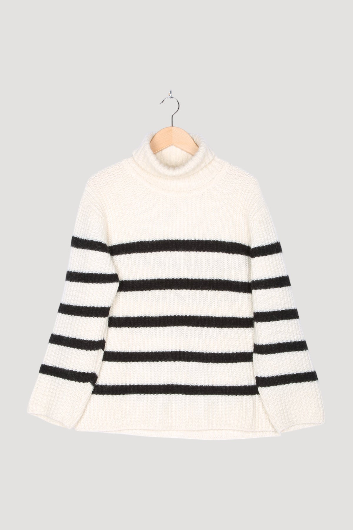 Mit diesem Pullover bekommen Sie den Luxus der Natur hautnah zu spüren. Gemacht in einem edlen Naturstrick mit einem wundervoll weichem Charakter. In einem legeren Design mit Rollkragen und überschnittener Schulter. Und überwiegend ungefärbt. Nur die Streifen wurden aus einem ökologisch und schadstoffgeprüft gefärbtem Garn gestrickt.