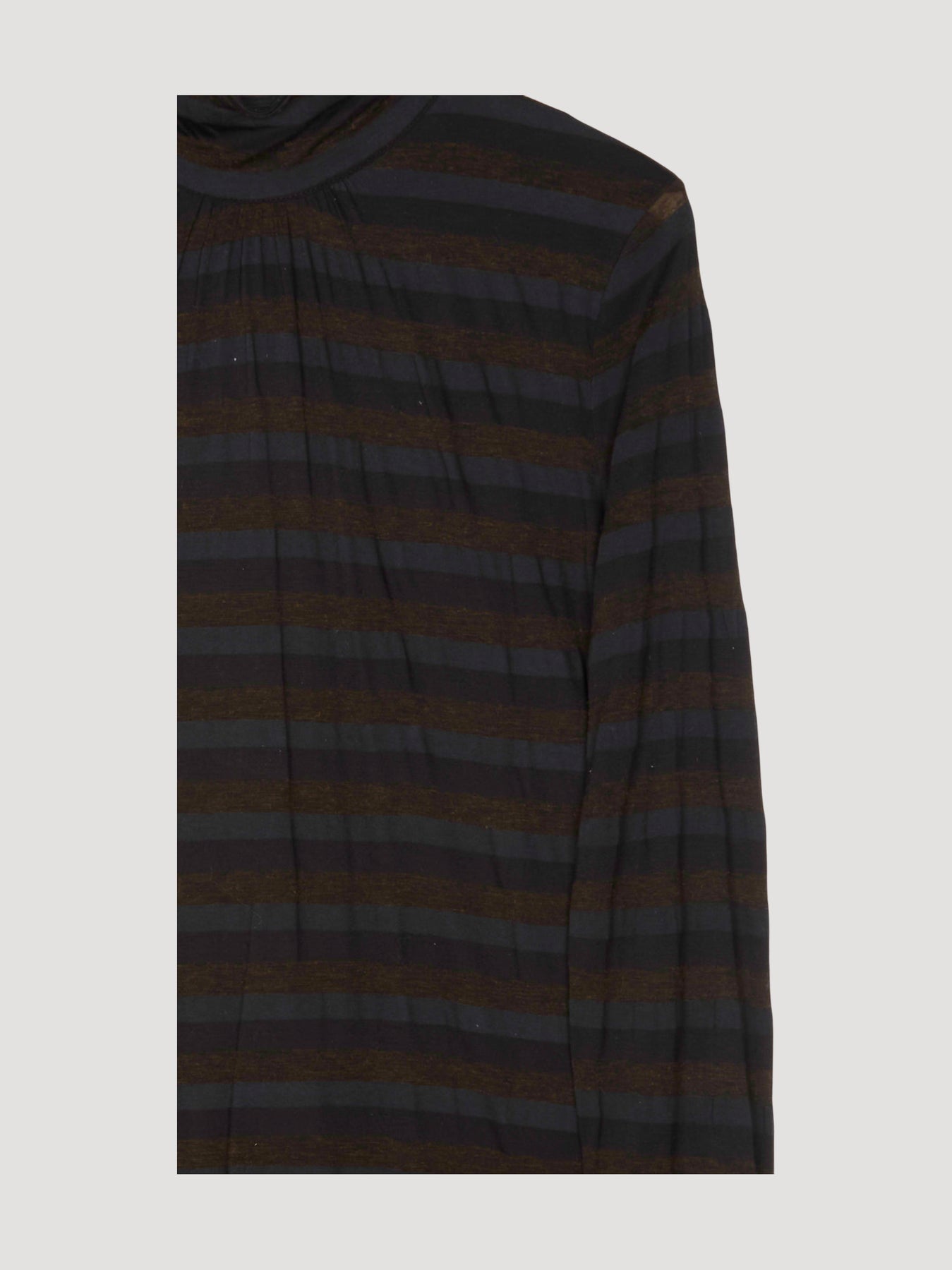 Was für ein Mix! Fein glänzender Modal, hautschmeichelnde Bio-Baumwolle und wärmende Schurwolle ergeben im Trio eine zart fließende Qualität, die sich toll anfühlt. Neu ist, dass die drei Qualitäten nicht schon im Garn eine Melange eingehen. Nein, hier zeigen sie ihre unterschiedlichen Charaktere in unifarbenen Ringeln: Durch die unterschiedliche Materialität ergibt sich ein feines Strukturspiel mit feiner Transparenz; im Rumpf gedoppelt. Die Kragenschluppe kann individuell geknotet werden, leicht transparente Ärmel addieren indes eine Dosis femininer Finesse.